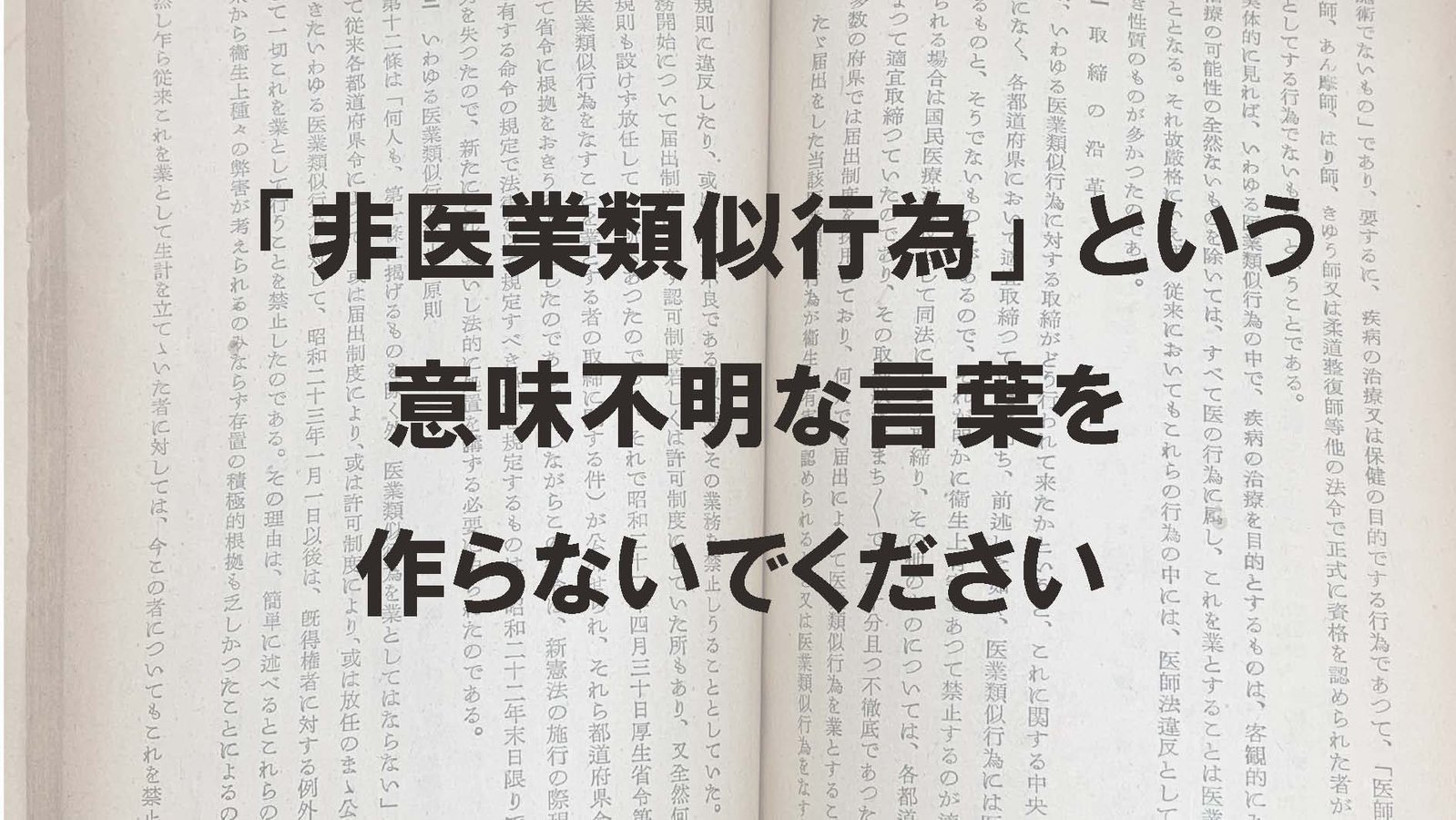 さて、今回開催された「あん摩マッサージ指圧師、はり師、きゅう師及び柔道整復師等の広告に関する検討会」で扱われた資料では、国家資格が必要になる鍼灸マッサージを医業類似行為、無資格者が施す整体やカイロプラクティック等を非医業類似行為としているのですが、非医業類似行為と言う単語は日本語的におかしいと思いませんか?